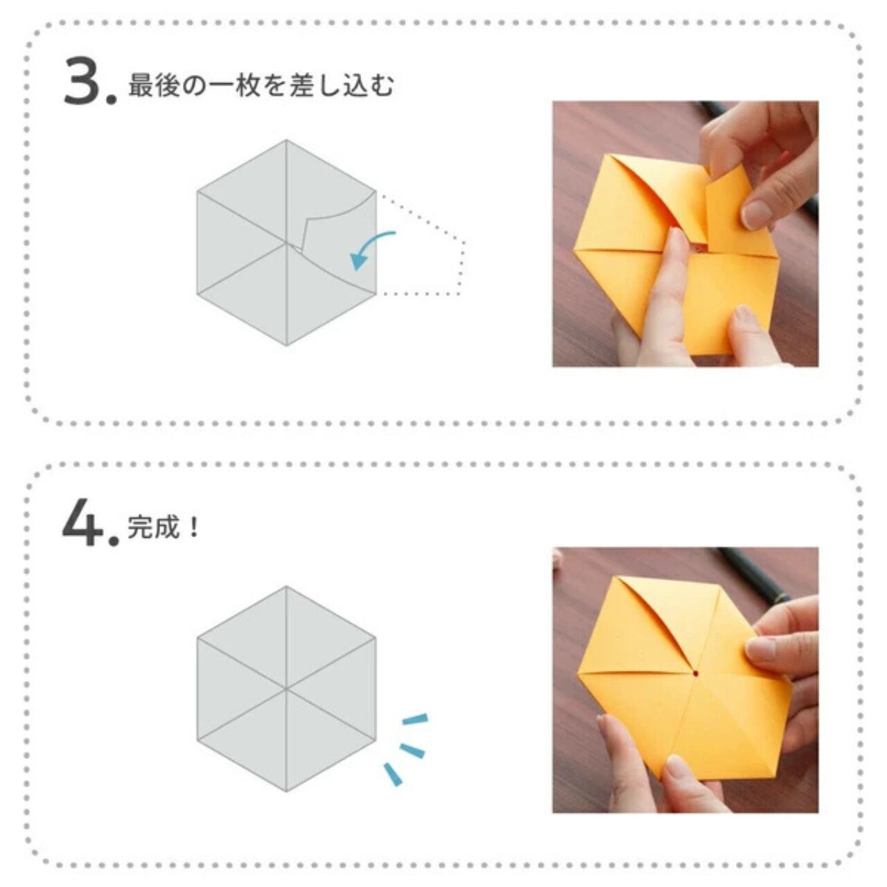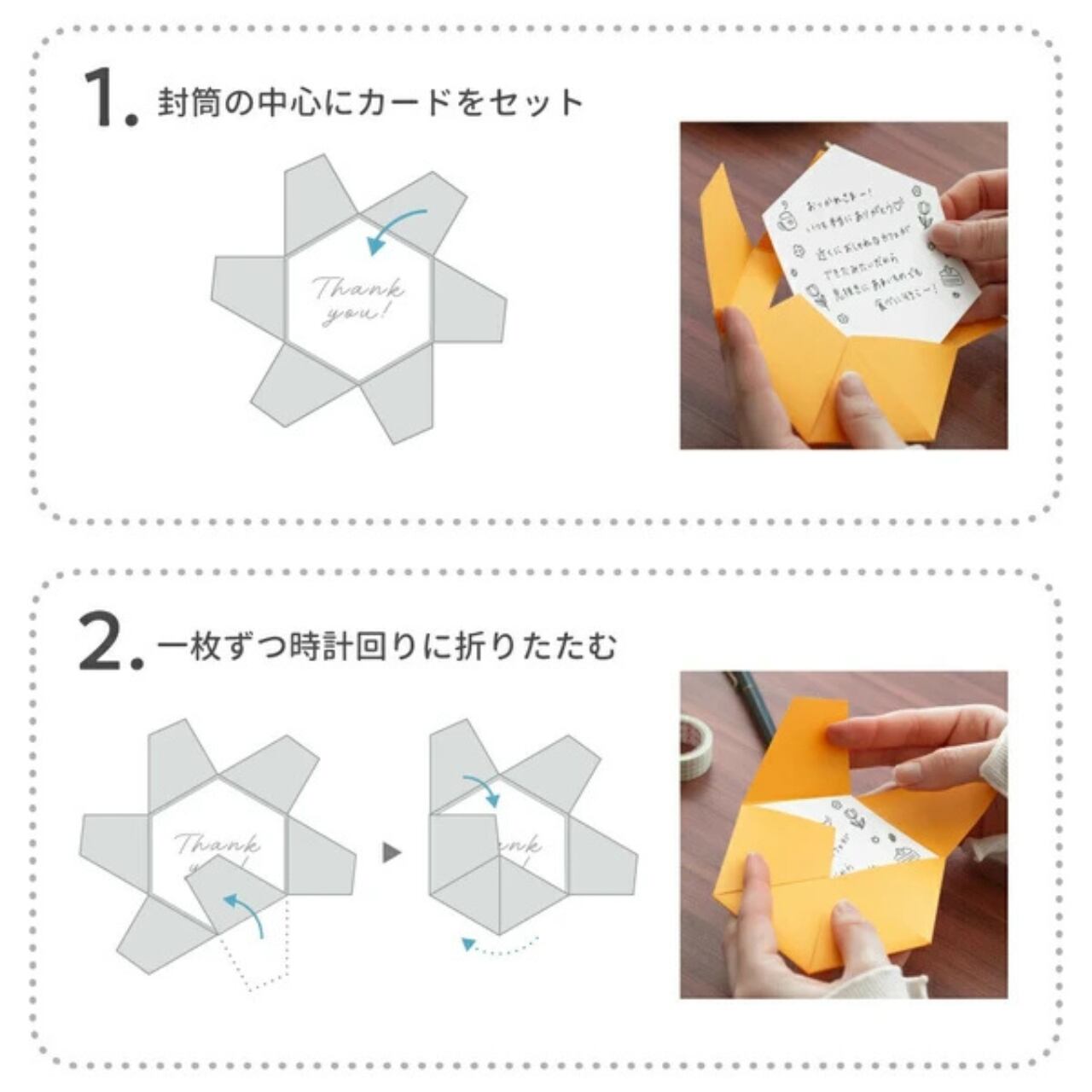 封筒は六角形のカードを包み込むように閉じられるユニークな仕様で、贈る楽しさ・開くワクワク感も演出できます。
