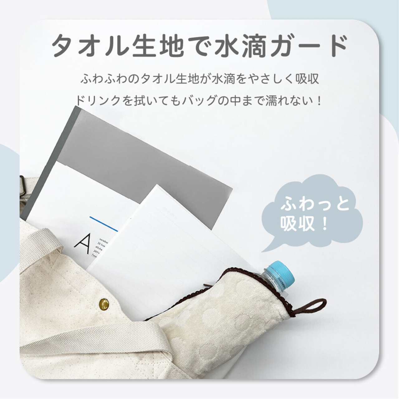 ファスナーを閉めるとペットボトルケースに。結露をしっかり吸収してバッグの中を清潔にキープ。