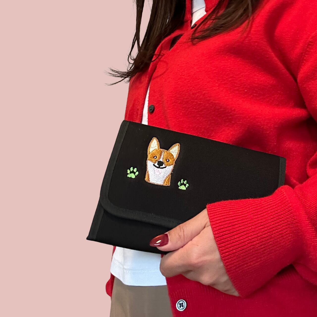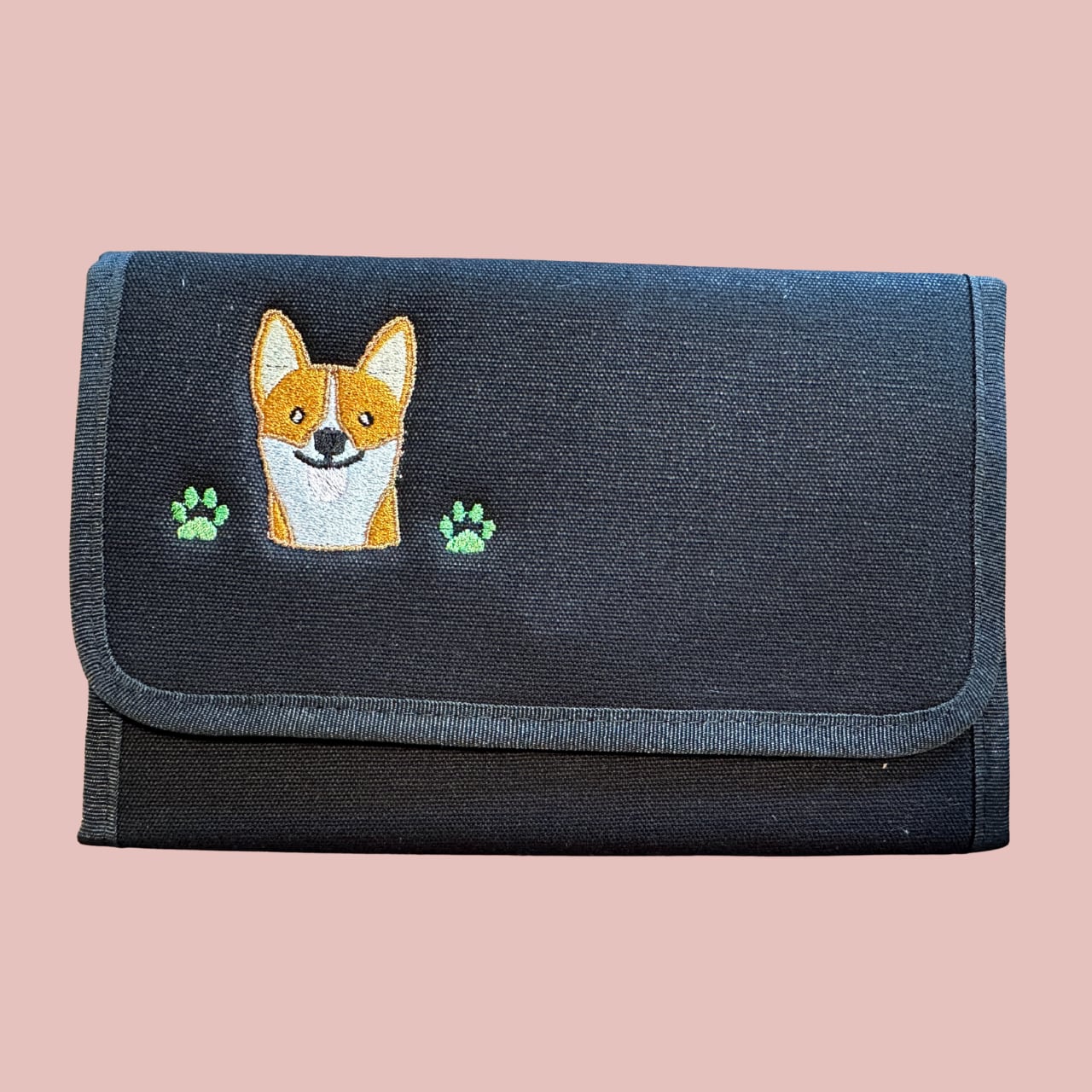 コーギー, 犬グッズ, 犬刺繍, わんこ, 手帳ケース, 母子手帳ケース, お薬手帳ケース, 通院ポーチ, ペット手帳ケース, かわいい, ギフト, 黒, ブラック, Corgi, コーギーパフ ,CorgiPuff