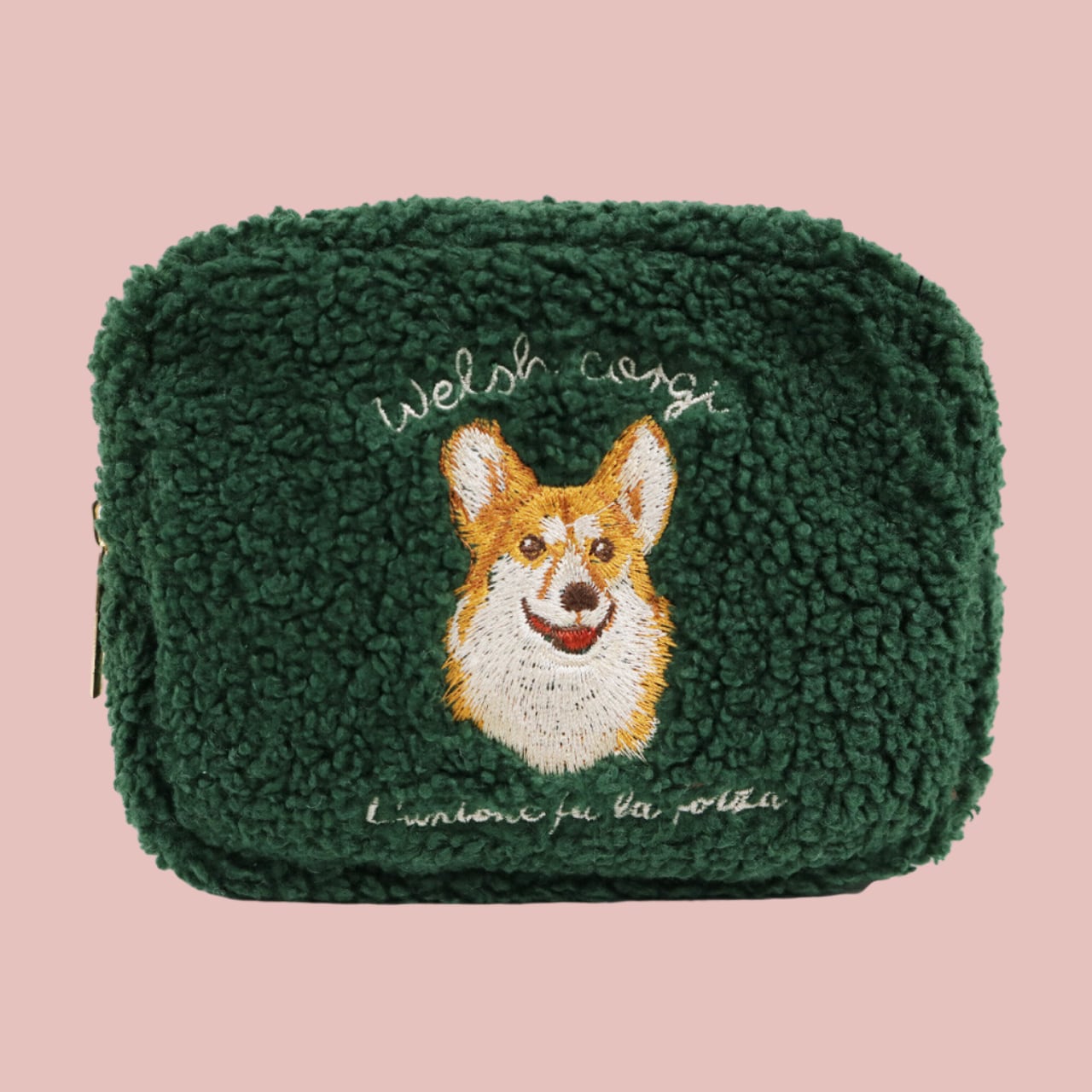 ふわもこボア×ウェルシュコーギー刺繍ポーチ 濃グリーン 犬雑貨
