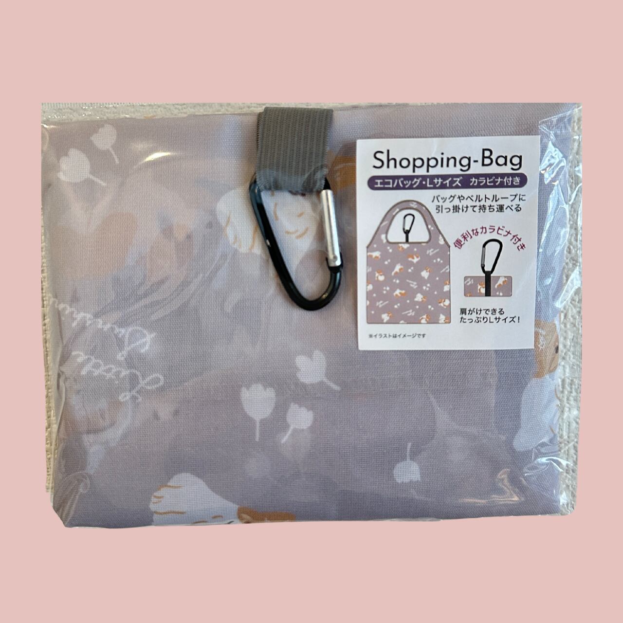 普段のお買い物やお出かけにぴったりな しっかりサイズの L サイズエコバッグ です。 カラビナ付きで持ち運びも便利!日々の生活の必需品に◎