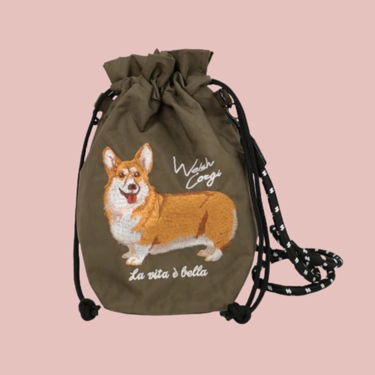 リアルタッチのコーギー刺繍が魅力の巾着ショルダーバッグ